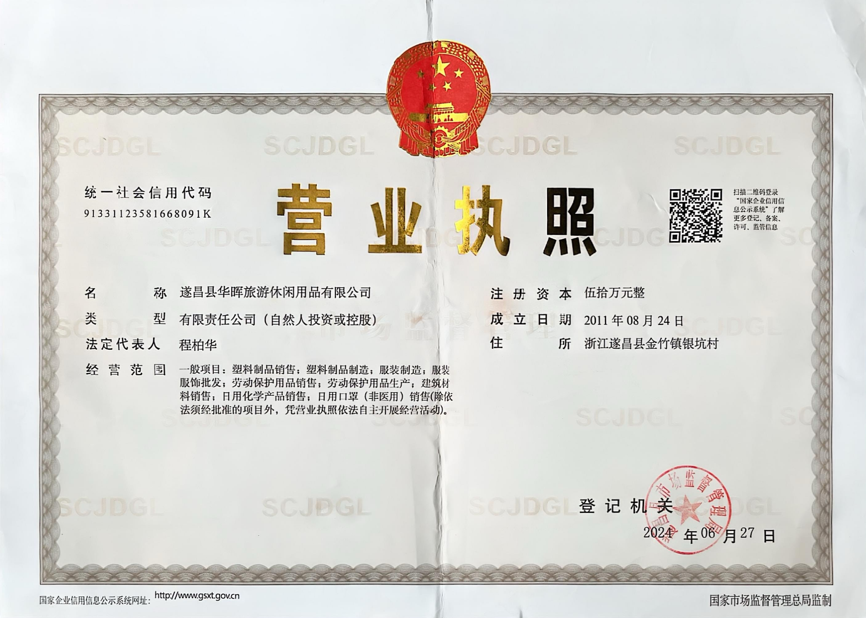 Nom du certificat: 遂昌县华晖旅游休闲用品有限公司